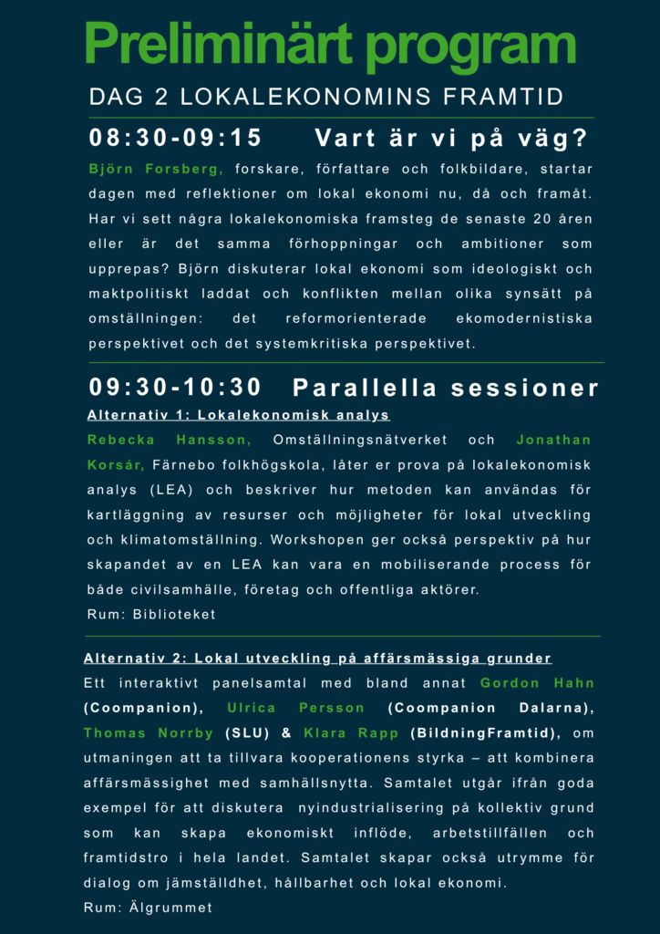 Björn Forsberg, forskare, författare och folkbildare, startar dagen med reflektioner om lokal ekonomi nu, då och framåt. Har vi sett några lokalekonomiska framsteg de senaste 20 åren eller är det samma förhoppningar och ambitioner som upprepas? Björn diskuterar lokal ekonomi som ideologiskt och maktpolitiskt laddat och konflikten mellan olika synsätt på omställningen: det reformorienterade ekomodernistiska perspektivet och det systemkritiska perspektivet.