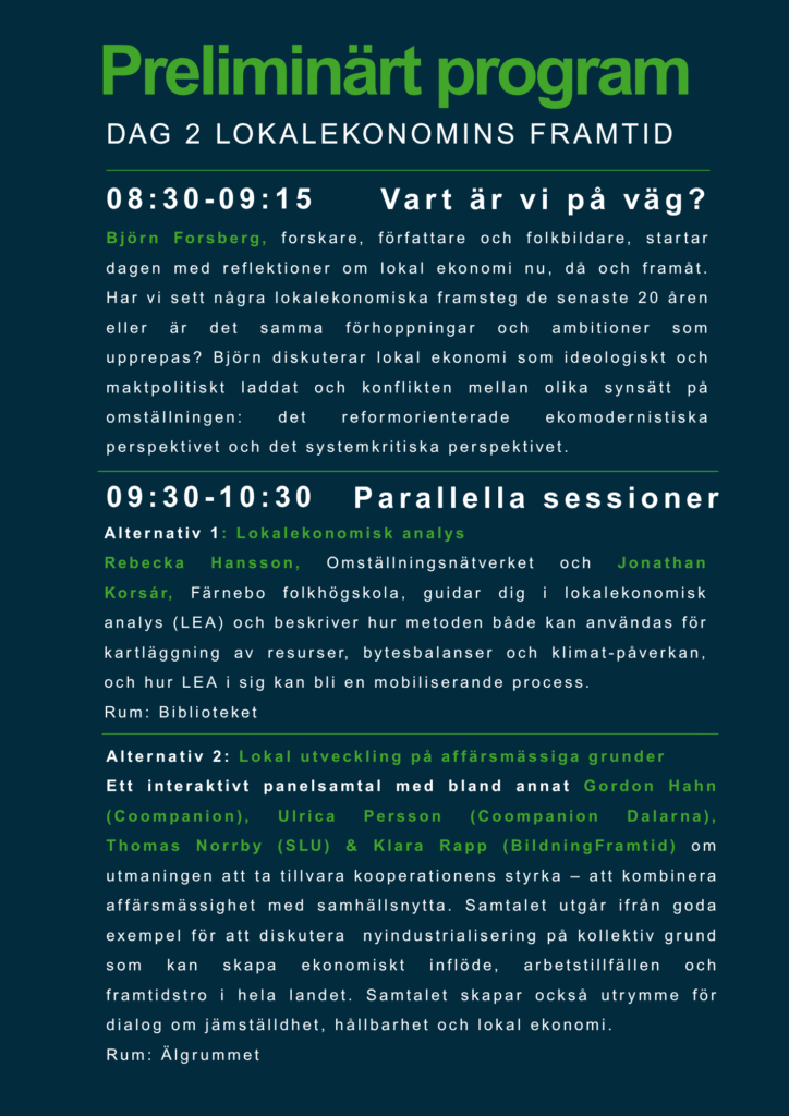 Konferensen utforskar hur kapitalflöden, företagande och lokalt engagemang kan skapa arbetstillfällen, stärka samhällsservice och bygga framtidstro. Som deltagare får du ta del av både forskning och praktiska exempel från olika delar av landet, där lokala initiativ har gjort skillnad för människor och bygder. Som en del av konferensen lanseras också boken ”Sätt ekonomin på plats!”, en samling berättelser, analyser och verktyg för att förstå och utveckla lokalekonomi i praktiken. Författarna ger nya perspektiv på hur lokalsamhällen kan bli mer robusta, hållbara och rättvisa i en tid av globala utmaningar.